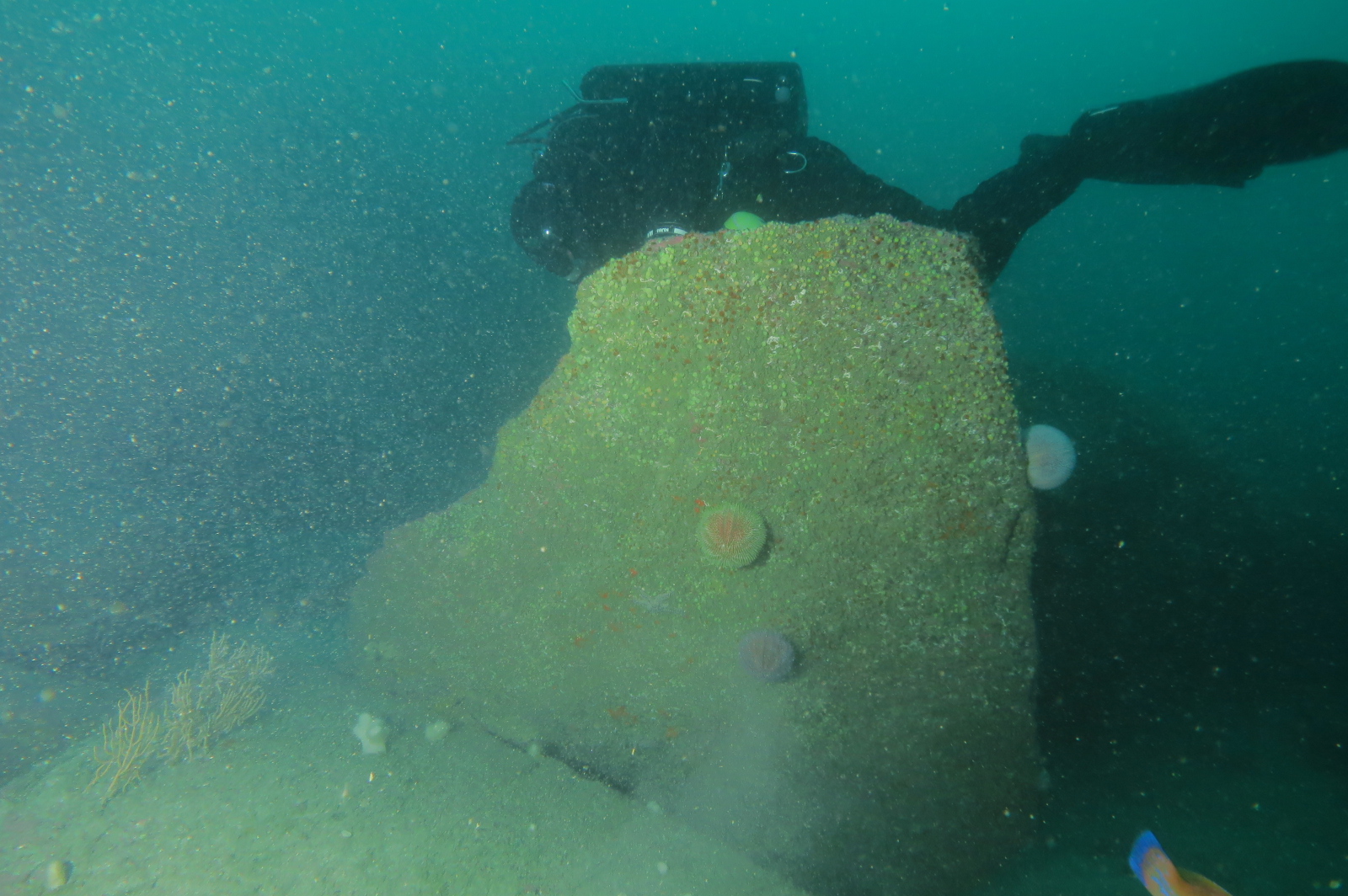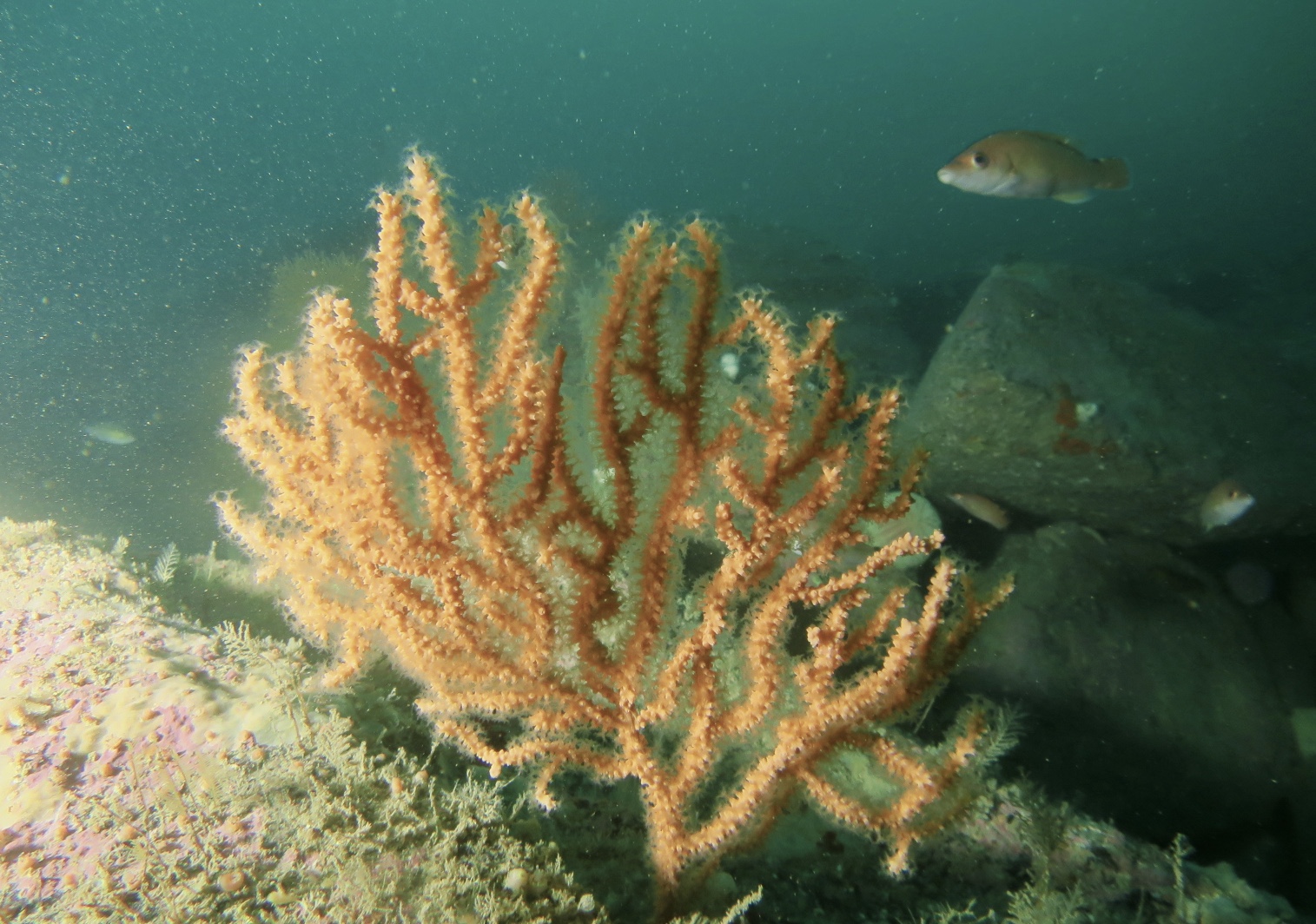 Lots of juvenile wrasse on the seabed at 30m amongst the Pink Sea Fans