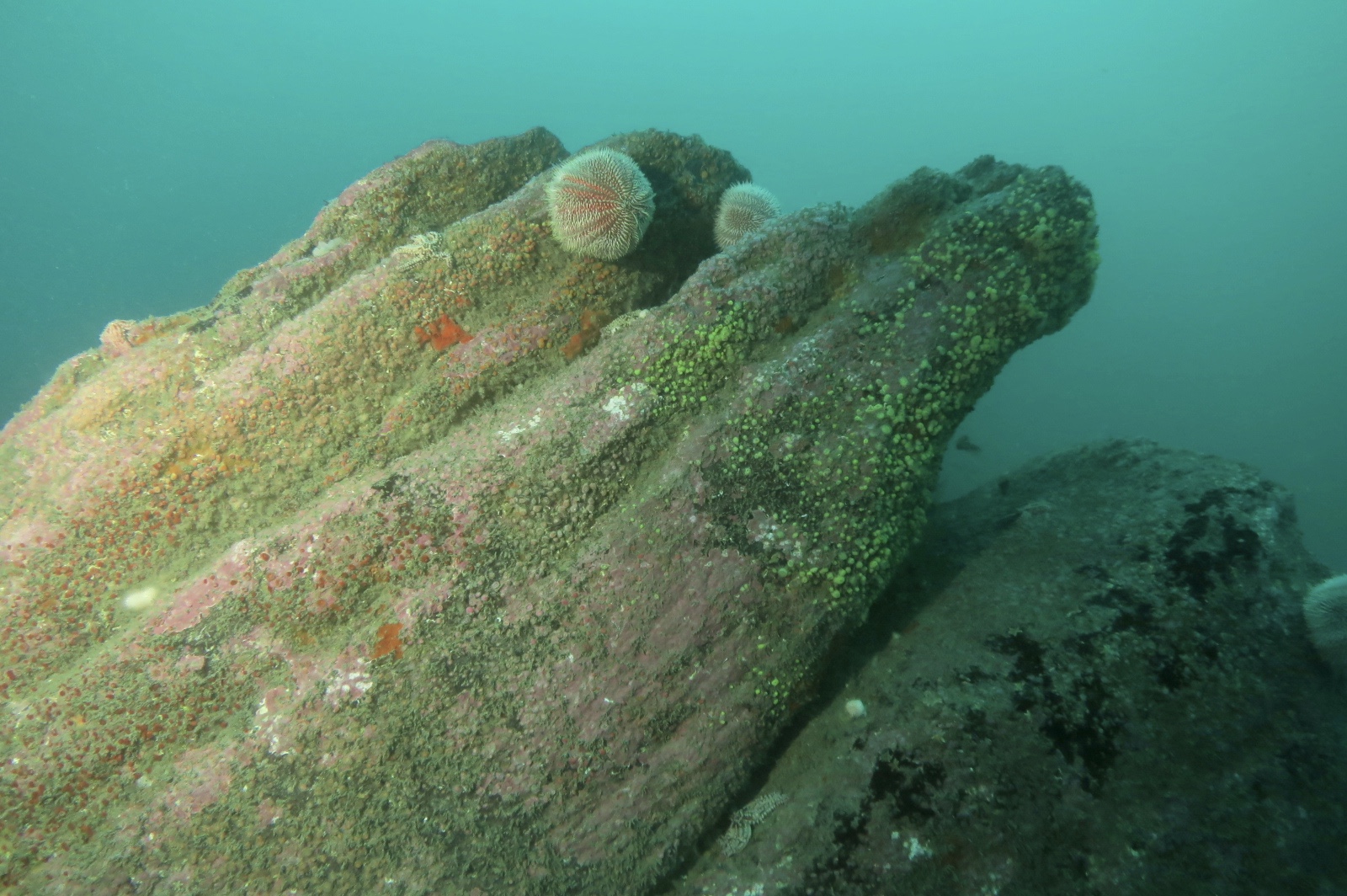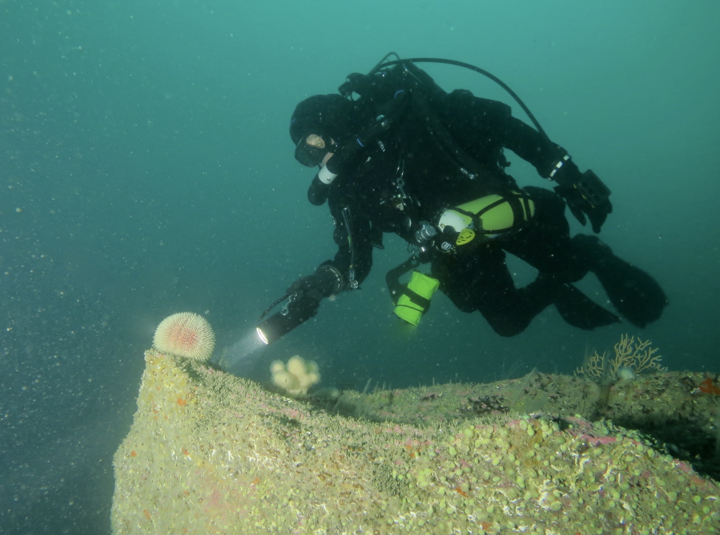 As the sea conditions were very good with just a soft swell, and the weather was dry and cloudy with no wind we just had to go back to Eddystone Lighthouse. We dived around the Horseshoe reef area (close to the lighthouse between the rocks either side, starting around 20m then heading sw/w to the deeper end at around 30m and going deeper. All the anenomes were closed up, and not much marine life about but lots of the usual crabs, starfish, sea urchins and seaslugs. Six divers enjoyed a dive between 50 – 65 mins as the vis is still a good 8-10m though not quite as clear as the other day, and still a good 11-12c sea temp.