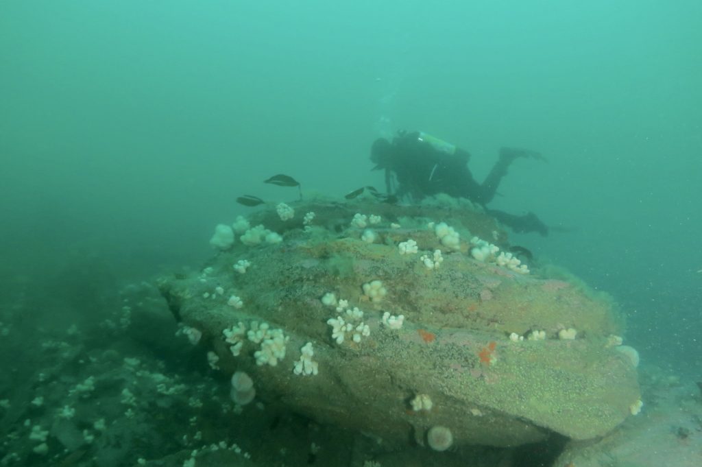 My first dive for two months so was a little apprehensive partiularly as the day started off at 0c air temperature. Nevertheless, after a bit of a lumpy bumpy chilly ride out to Eddystone North Pinnacle and waiting for four divers to complete their dive, John Shelley and I dropped in to find BLUE sea (yes blue sea) and hardly any bits in the water column. On the bottom at 28m the sea temp was 11-12c and I reckon at least 10m+visibility!! what a treat this was. Hopefully my pictures will show how great it was out there today. Thanks John Shelley for running the dive and being a great buddy / model